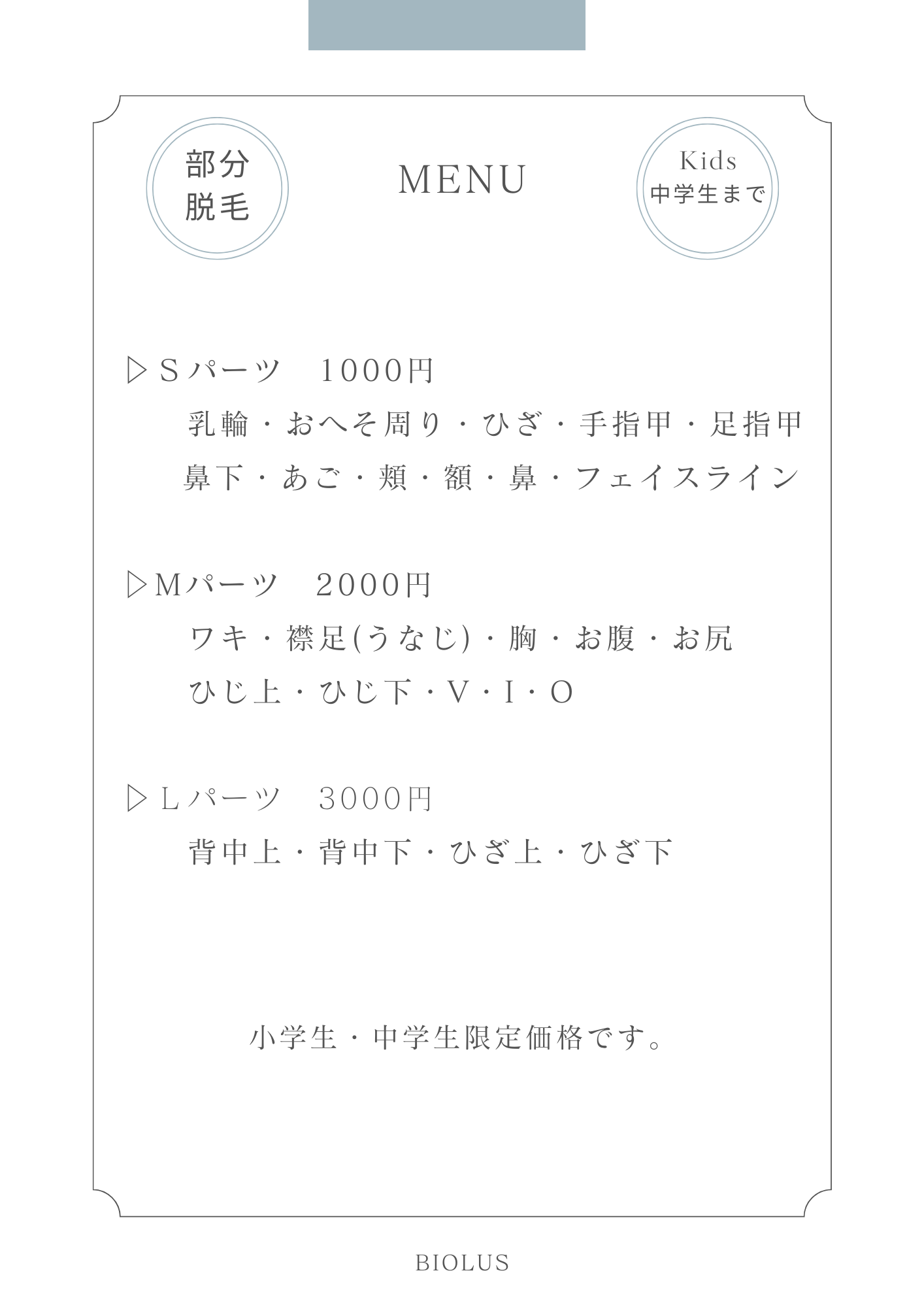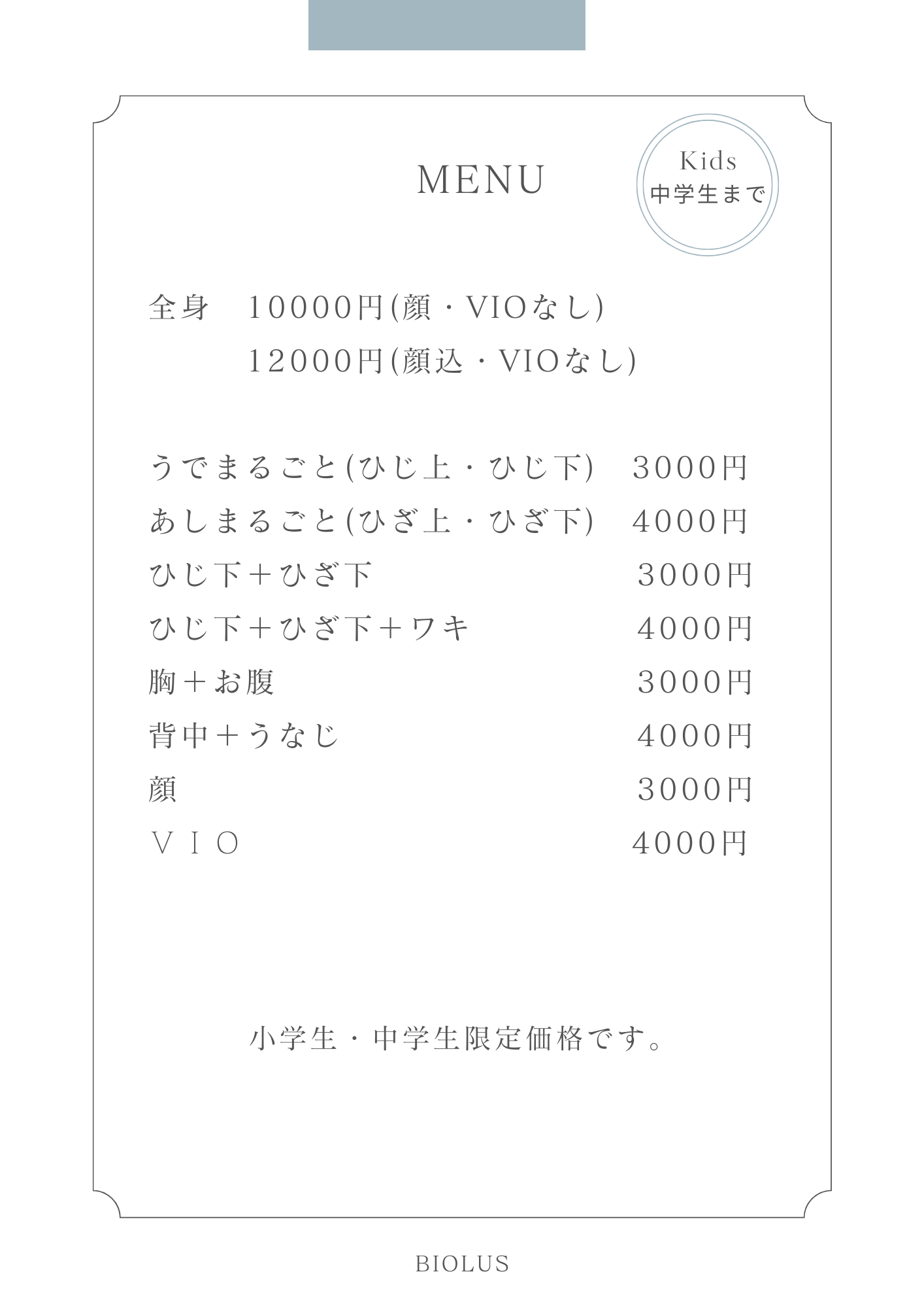 当店では、お子さま向けのキッズ脱毛メニューをご提供しております。